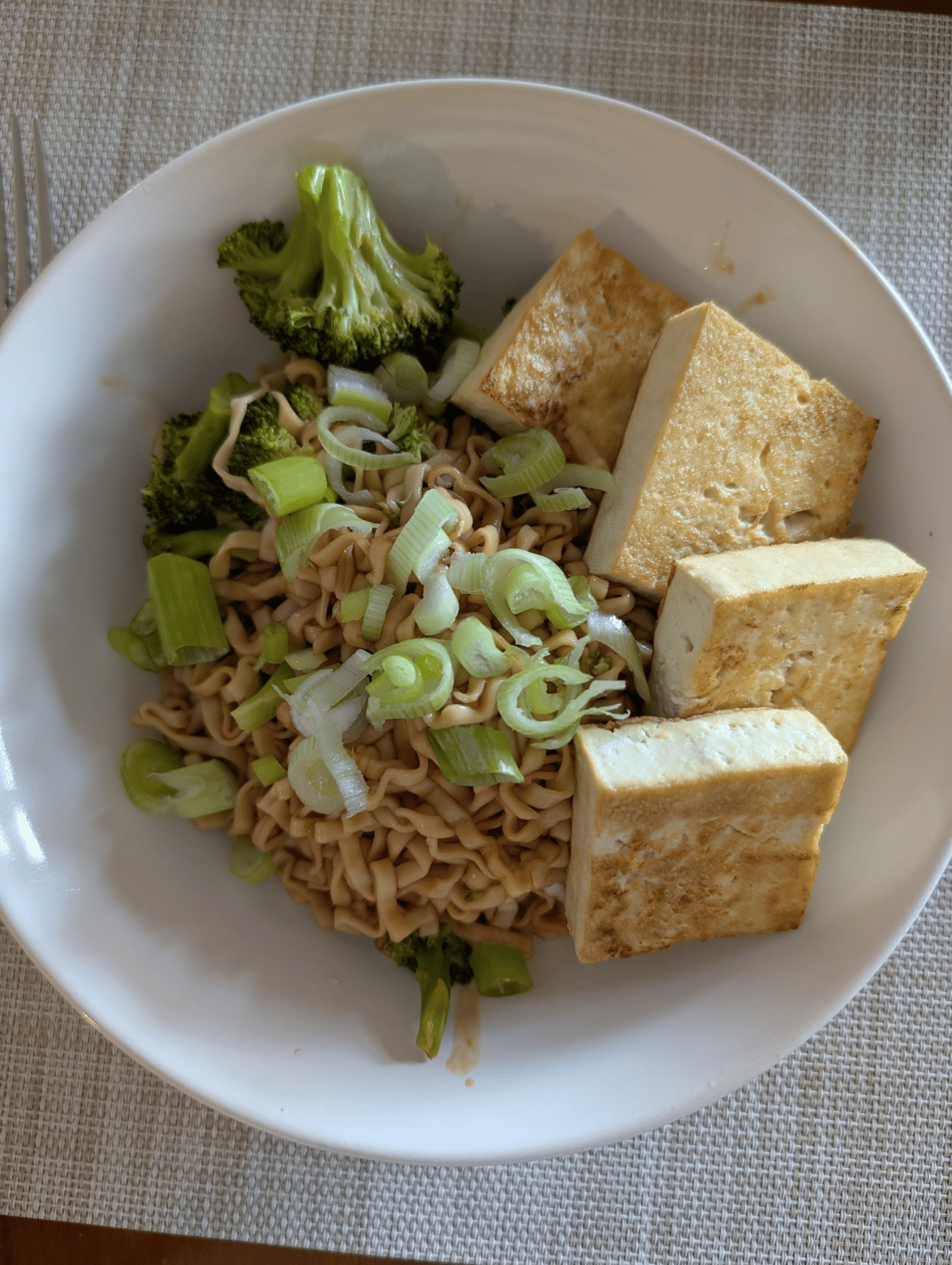 This is my go-to noodle dish: ramen with tofu and broccoli. I use Momofuku’s Soy and Scallion ramen (it’s not a soupy ramen) and it’s delicious. Here’s the recipe: sauté extra firm tofu slices in a little sprinkle of oil in a non-stick pan. When the tofu is golden on both sides, boil the broccoli and ramen together. Drain, add the sauce packets, then dish up with the tofu. Top with sliced scallions. Eat!