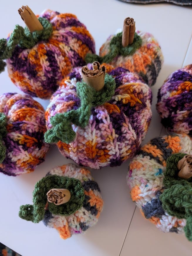 I’ve picked up my crochet needle again (it’s been nearly a year) and started working on crocheted pumpkins. The stems are cinnamon sticks!