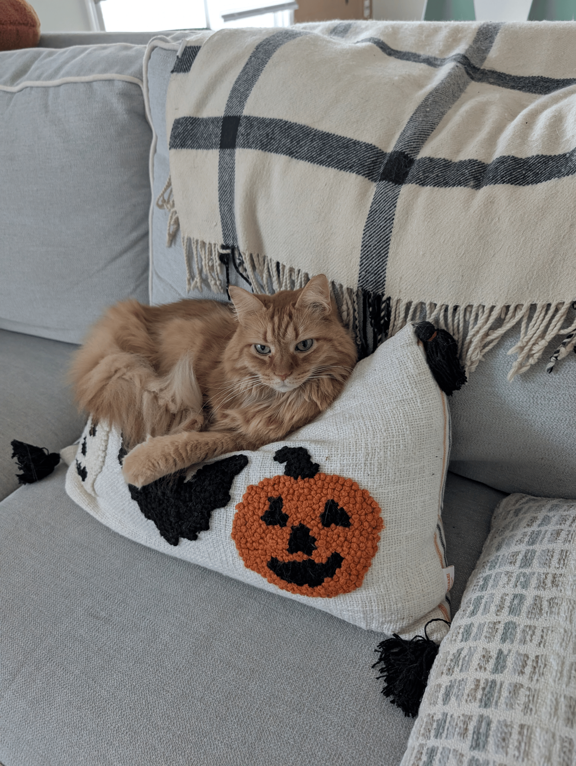 My heart squeezes painfully when I think of how old Wallace is getting. He’s 11. That’s geriatric for a cat. But the shots really have given him so much pep in his step. Lately, we’ve been sitting curled up on the couch together, him sleeping, me crocheting pumpkins and watching Buffy. It’s a good life.